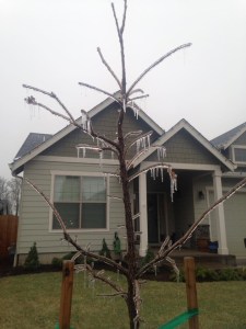 At our same house, the City of Eugene chose to plant an oak tree, a very nice one mind you, in the grass strip between the sidewalk and the street. It’s a 5-year old beauty now. In 30 years it will have buckled the sidewalk, cracked the asphalt, and given the sewer folks a run for their money. Here it is last summer and here’s an idea of what’s coming up in a few decades. And then a shot of its babyhood during an ice storm, which, by the way, it weathered better than most of its larger brothers and sisters.